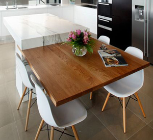 The dense hardwoods stand up well in the kitchen. The species you choose will probably depend on the colour you want. Tasmanian oak and Victorian ash are light coloured timbers. Blackbutt ranges from a pale cream colour to pale brown and sometimes has touches
